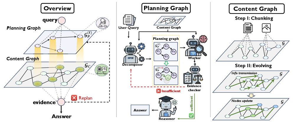 Researchers created a system that thinks about documents the way your brain does, using two complementary maps. The first preserves the natural structure of information, keeping figures connected to their captions and related text passages linked together. The second tracks the reasoning process itself, breaking complex questions into smaller parts while maintaining awareness of what has been discovered and what remains unknown.